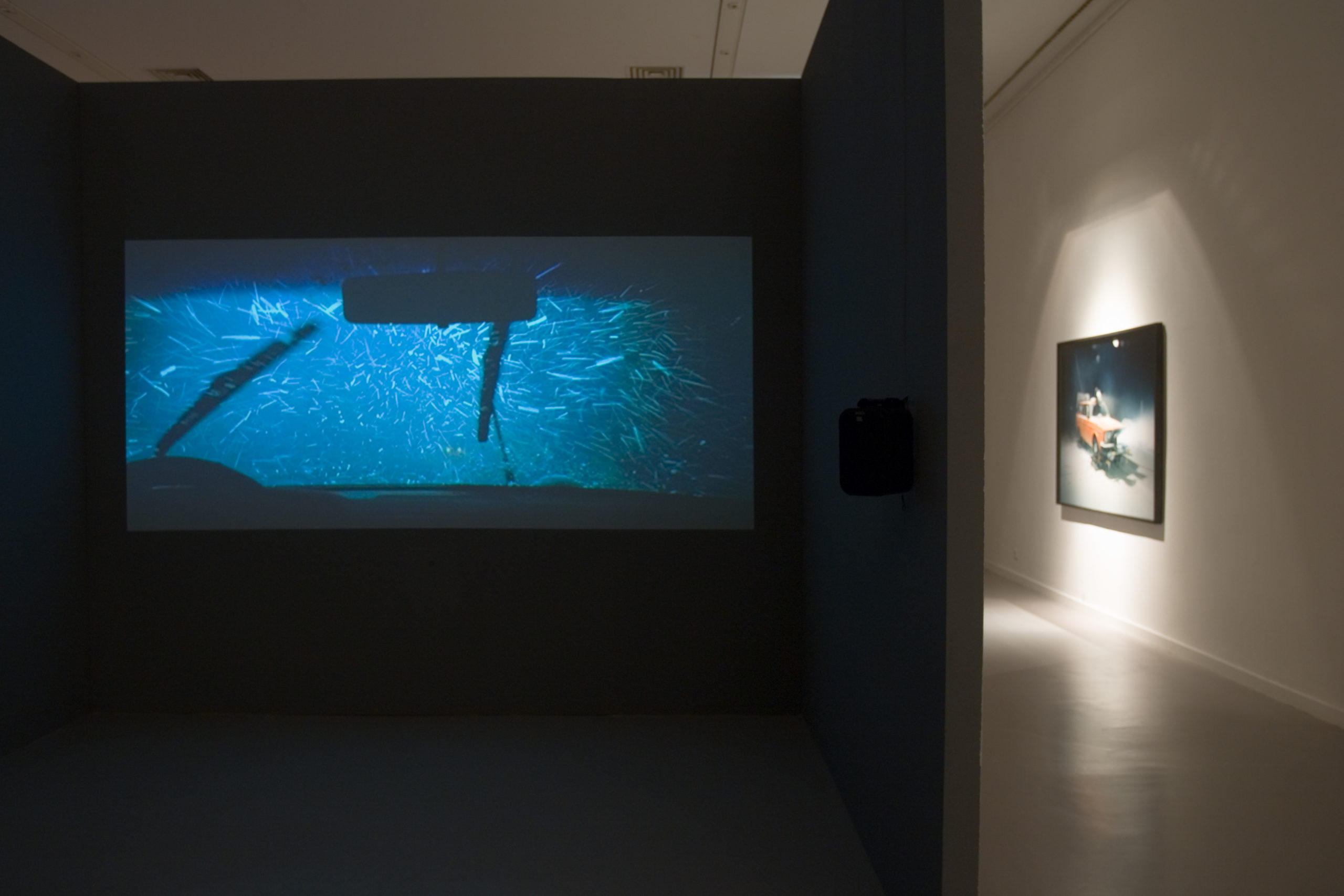 Accompanying the film, but never in the same space, is a large color photographic production still of an orange Volvo station wagon, raised up on dolly wheels and elaborately outfitted with lights and cables, inside a film studio. The room is filled with the hazy residue of fog and snow machines. In the background, artificial snow banks and a prop sign can be seen.