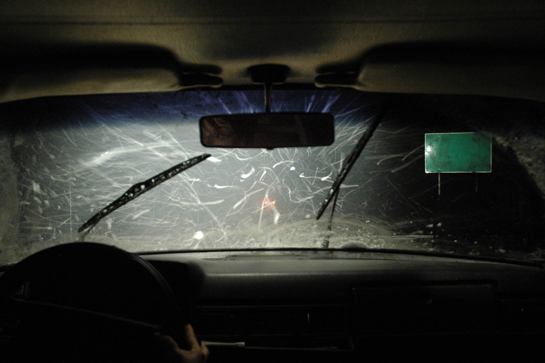 Near Miss consists of three nearly identical cinematic “takes.” In each, the camera is positioned inside a car that appears to be driving late at night though a snowstorm. Highway markers and a road sign slip by on the right, and the red tail-lights of another car can be seen in the distance on the road ahead. After about a minute, the car begins to lose traction, fishtails, then spins around to face the way it came, sliding backwards until it finally comes to a stop. The image cuts to black, and after several seconds, another take begins. Each take is accompanied by its own unique sound track, and each reveals subtle differences in the details of its execution.